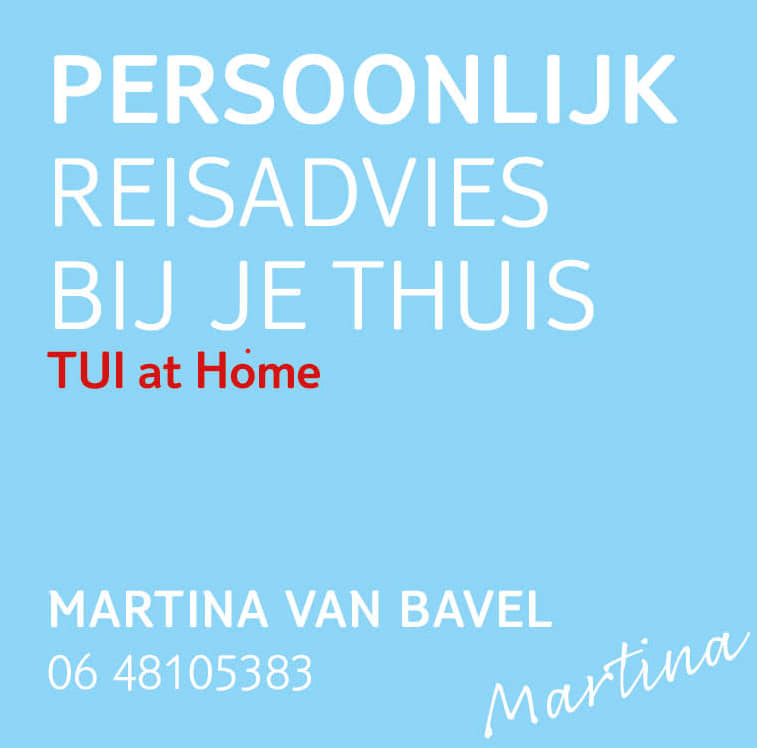 Martina van Bavel is de trotse eigenaar van TUI at Home – Martina van Bavel, een zelfstandig reisbureau dat al vele jaren gespecialiseerd is in het samenstellen en verkopen van volledig op maat gemaakte reizen.